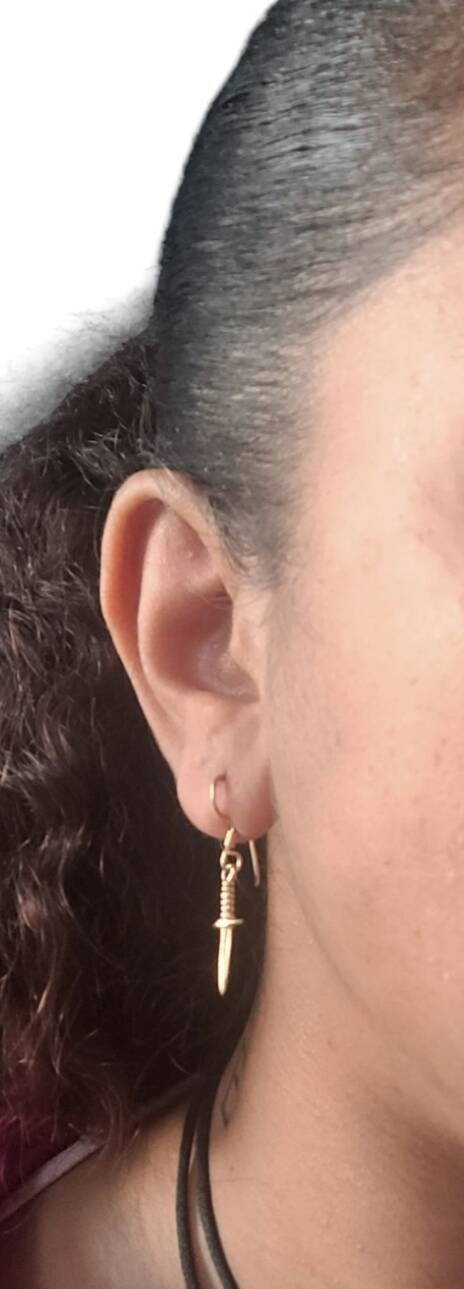 Petites boucles d'oreilles dorées en forme d'épée, un détail original et affirmé. Acier inoxydable, robustes et élégantes pour une touche de caractère subtile.