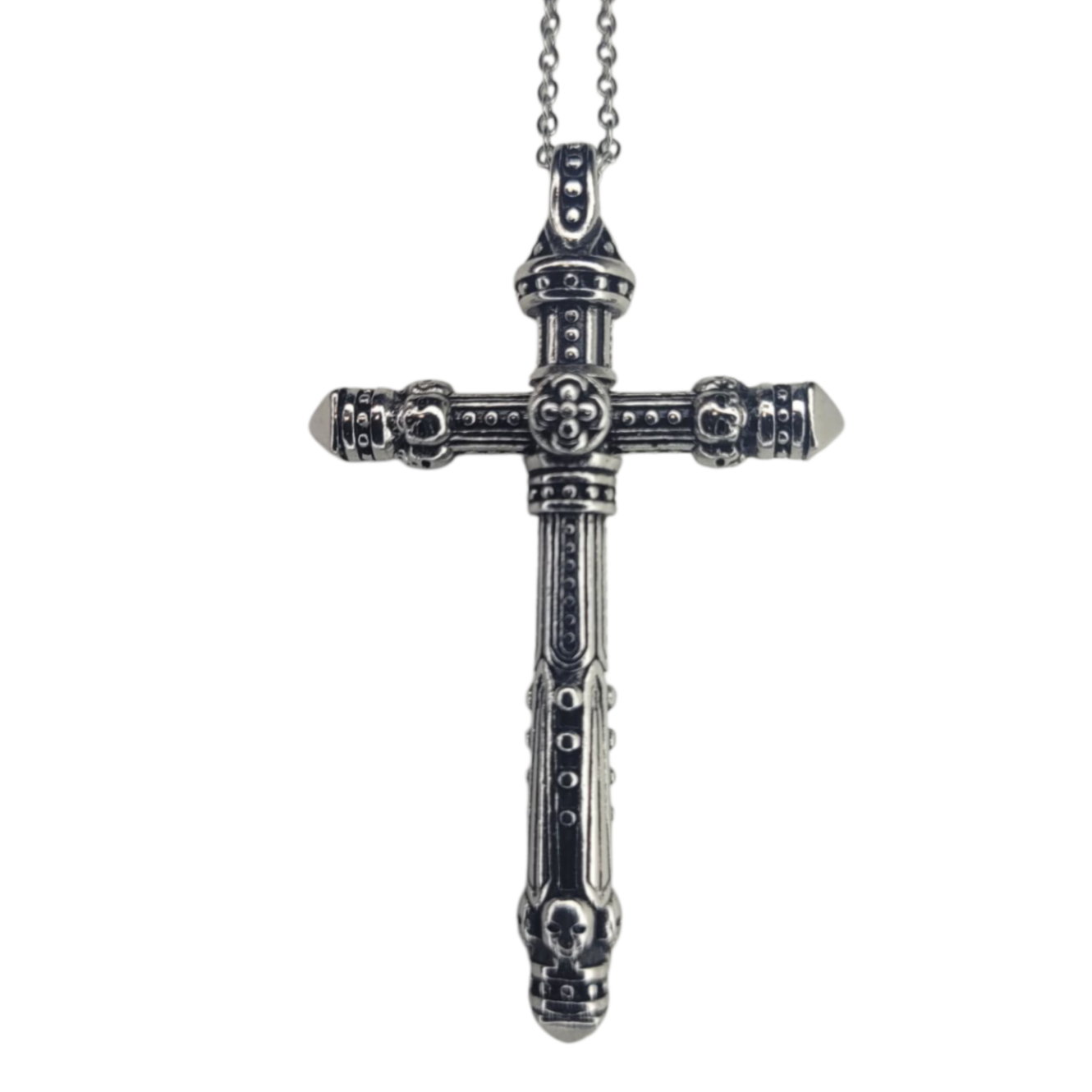 Ce pendentif unique en argent 925, où une croix élégante se pare de subtiles têtes de mort à ses extrémités, est plus qu'un bijou : c'est un symbole de force tranquille et de rébellion douce. Monté sur une chaîne fine, il enlace votre cou d'une aura de mystère captivant.